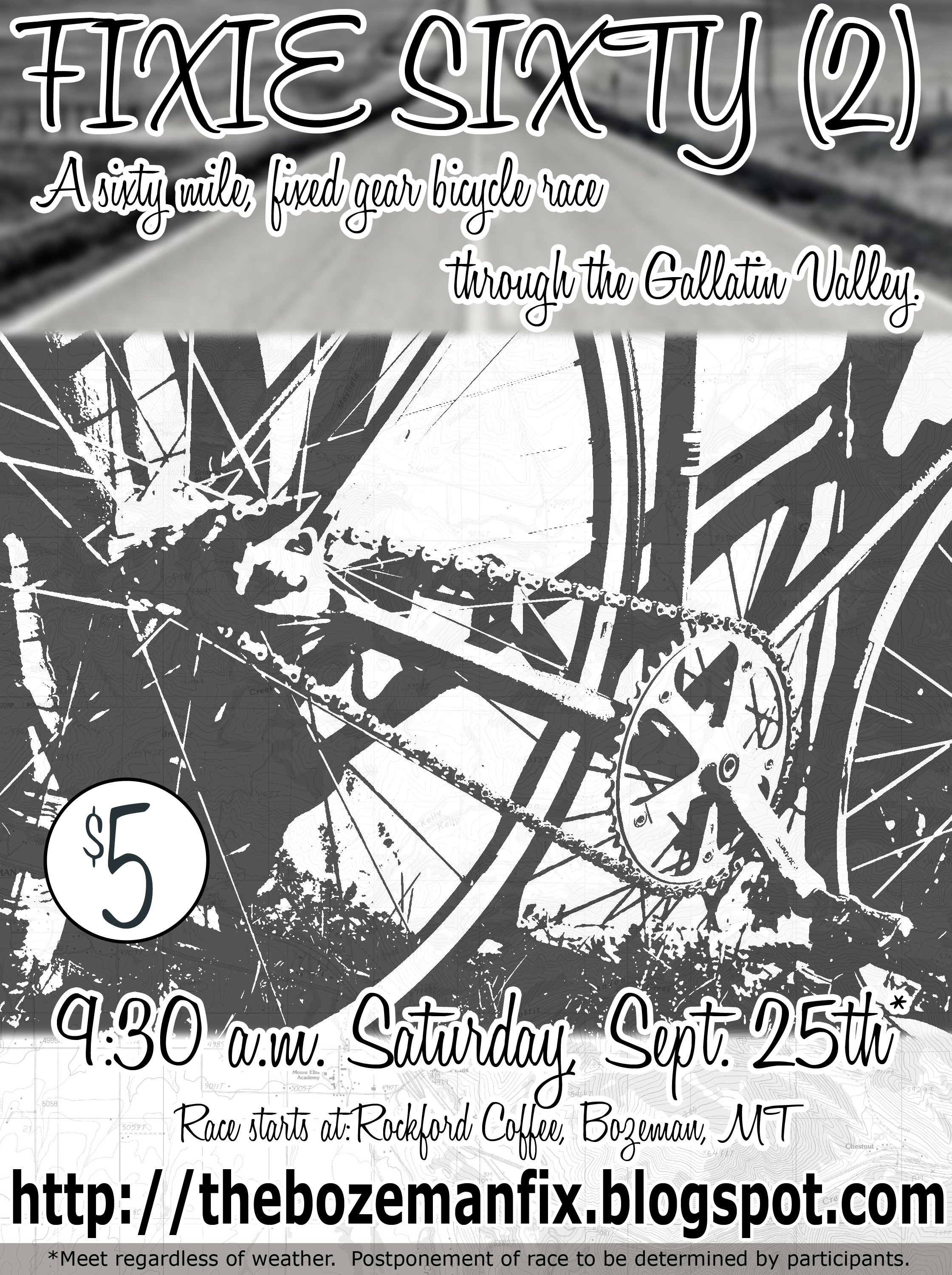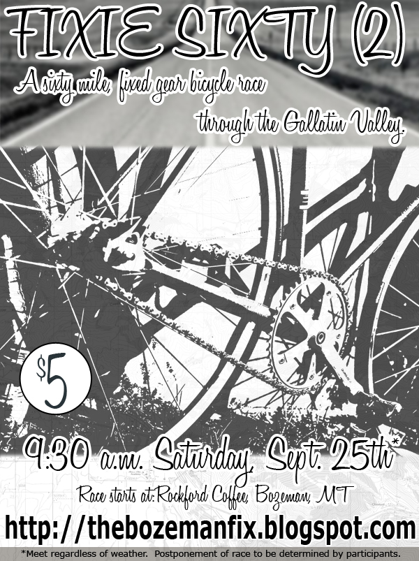 The Fixie Sixty was first held in October 2008 with an excellent showing of Bozeman cyclists turning out for a sixty mile course around the Gallatin Valley. With the fall season fast approaching it's time to hit the streets, highways, and dirt roads once again for the Fixie Sixty (2).