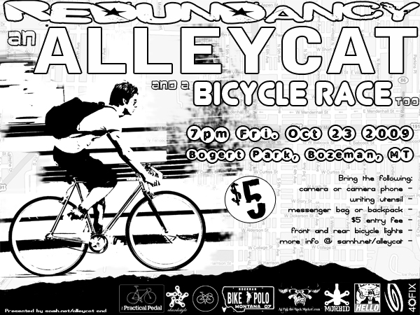 REDUNDANCY ALLEYCAT 2009 is an informal bicycle race presented to you by samh.net. For those unaware, Alleycat races are regularly organized events often found in cities across North America, Europe and Asia with strong bicycle messenger cultures. As Bozeman has no messenger culture Alleycat races are instead frequented by the urban cyclist culture (yes, that means you too are also invited as well, hipsters).