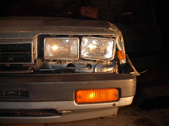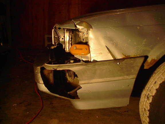 After a small collision between the Honda and some variety of Oldsmobuick, considerable damage was done to the front left quarterpanel, blinker and headlight. One of the Honda's first custom mods was to attach a new blinker bulb and cover. New wiring, wire-nuts, electrical tape and sheet metal screws made the Honda street-legal again. |
