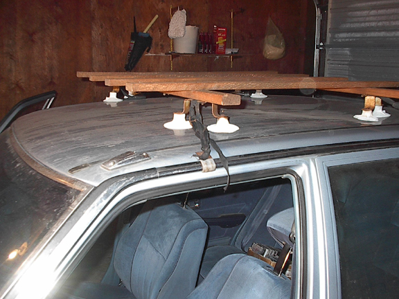 This roofrack was custom built by the original owner of the car for his previous car (Original Yellow Volkswagen Beetle) and then passed along to me with the vehicle. A few coats of stain and polyurethane, some new straps and suction cups and the Honda is ready to carry gear. |